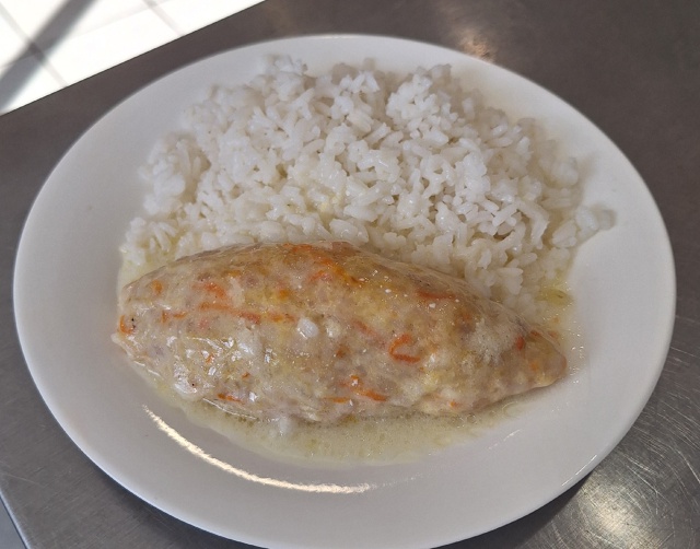 Фарш куриный, рис, лук и морковь жареные, яйцо, специи, соус сметанный