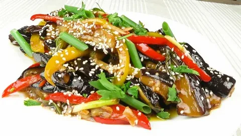 Баклажаны жареные, помидор, перец болгарский, фасоль стручковая, соус кисло-сладкий