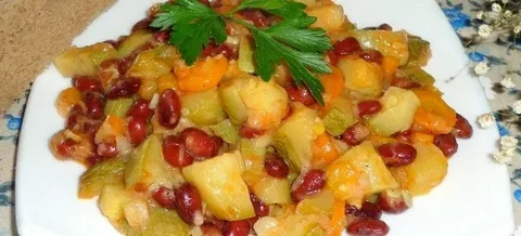 Кабачок, морковь, фасоль консервированная, перец болгарский, томат, масло растительное, специи
