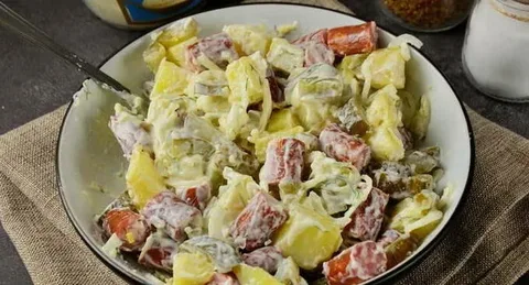 Колбаски жареные, фасоль, картофель, лук красный, грибы, огурец консервированный, майонез